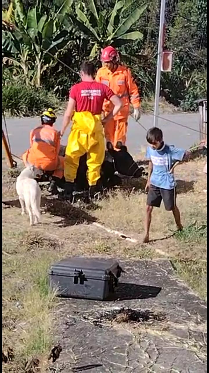 Na manhã deste domingo (10), o Corpo de Bombeiros resgatou um bezerro que havia caído dentro de uma fossa séptica no Bairro Jardim Candelária, em Divinópolis. Quando chegaram os militares observaram que se tratava de um animal com aproximadamente 300 kg e estava no fundo da fossa a aproximadamente três metros de profundidade.Para o resgate foi montado um tripé com sistema de redução de força para içamento do animal. Com uso de equipamentos de proteção individual e também do macacão sanitário, um Bombeiro Militar entrou na fossa, realizou as amarrações necessárias e em seguida o bezerro foi içado para fora em segurança.