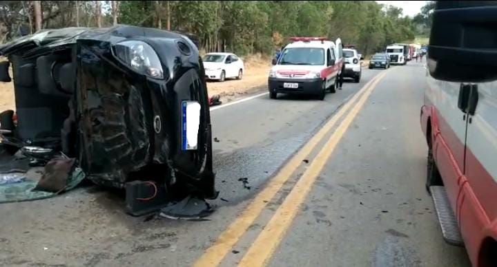 Um carro capotou e deixou três vítimas presas no interior do veículo, no distrito de São José dos Salgados, em Carmo do Cajuru. O acidente aconteceu no início da manhã desta quarta-feira (21).