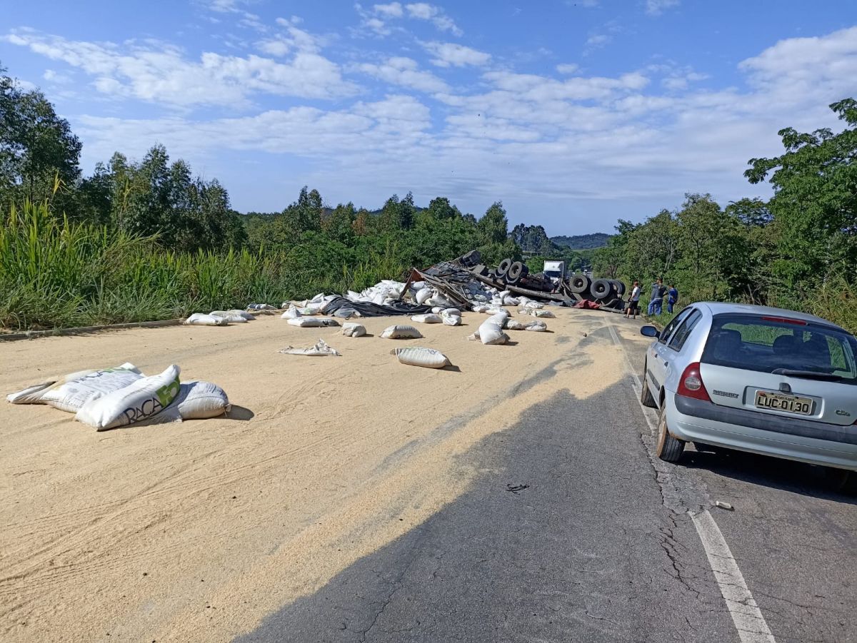 Uma carreta carregada com farelo de soja tombou no quilômetro 35 da MG-431 em Itaúna. O acidente foi na manhã desta segunda-feira. O motorista de 39 anos, estava consciente e com quadro de saúde estável, por isso não precisou de atendimento hospitalar. O Samu chegou a ser chamado, mas diante da situação, liberou o motorista no local do acidente. O trânsito ficou interrompido nos dois sentidos.